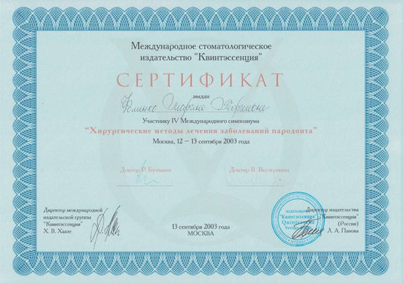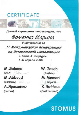 ГБОУ ДПО «Российская медицинская академия последипломного образования Росздрава» г. Москва, 2008 г. «Стоматология хирургическая»